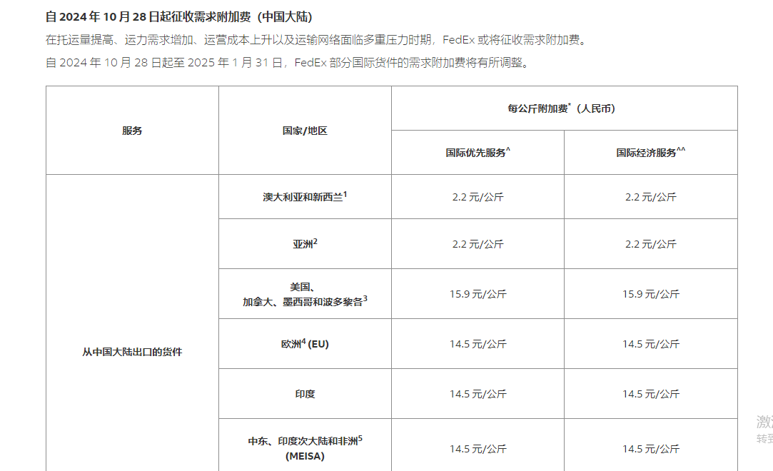 自 2024 年 10 月 28 日起至 2025 年 1 月 31 日,FedEx 部分国际货件的需求附加费将有所调整。